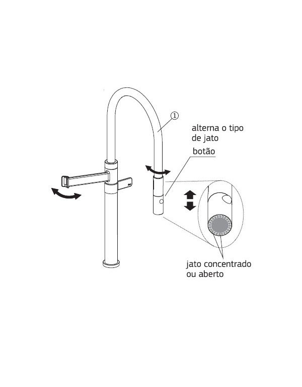 Bica móvel, permite o direcionamento do fluxo de água. Maior conforto e maior funcionalidade ao produto (na cozinha permite a utilização de cuba dupla, verifique medida do produto e da cuba dupla). Arejador Embutido.